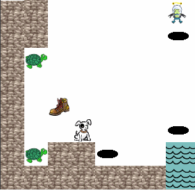 This game was written as a way to procrastinate from doing real work. TurtleDash is a cheesy (yet hopefully entertaining) tile-based game that is somewhat of a cross between frogger and lemmings. Your mission in this game is to save a bale of baby sea turtles from nasty aliens, bottomless pits, and stomping feet. You have a pack of trained dogs at your command to assist you in your task. Yes, the concept is pretty wacked out but that's what happens when you live in Alaska for too long and have graphical artistry skills as limited as mine. TurtleDash requires excellent multitasking skills, a quick mind and an even quicker pen! See the instructions for more information. The game also includes a level editor.